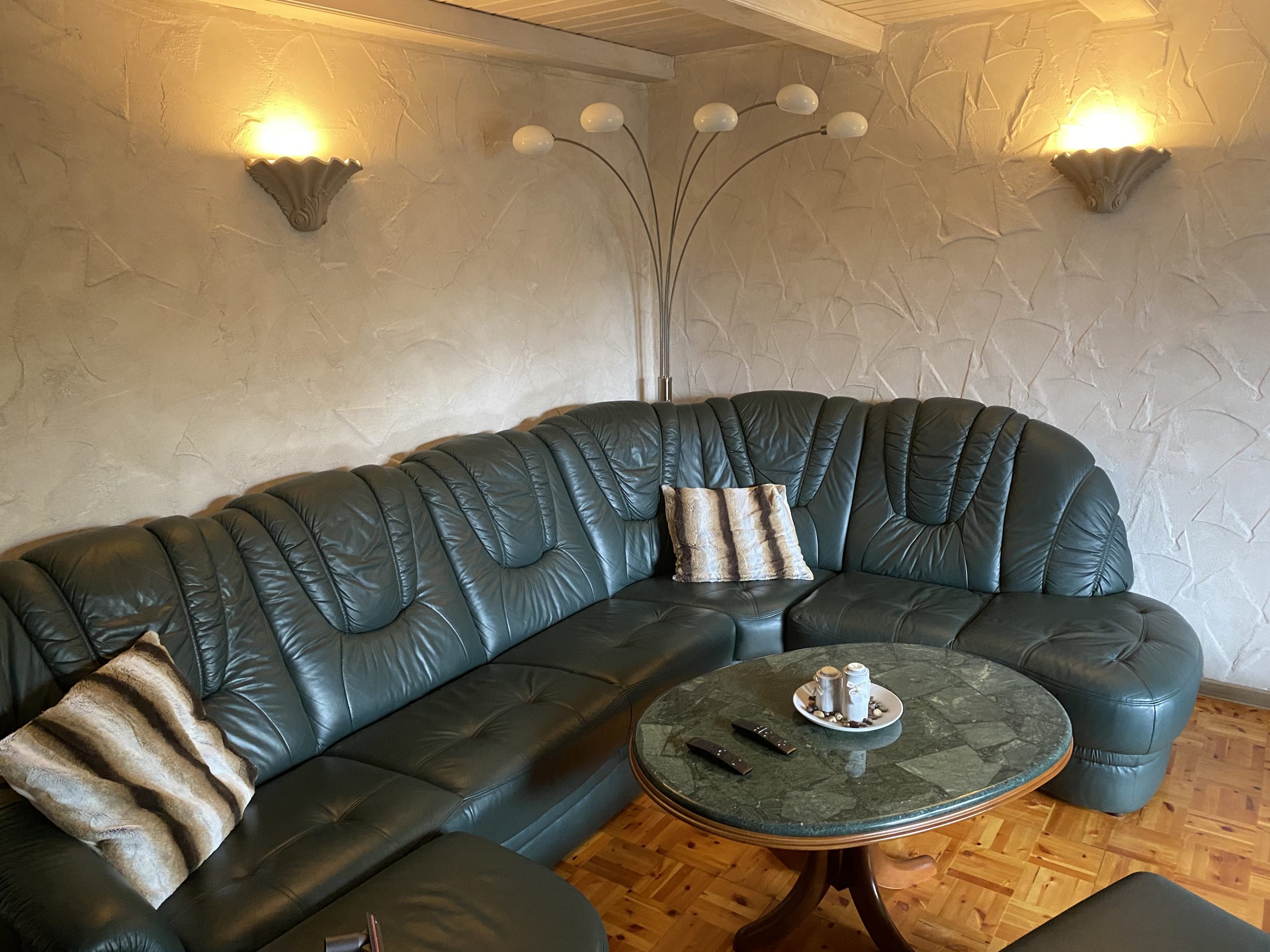 Das Kaminzimmer ist einer der zentralen Aufenthaltsräume des Hauses. Das großzügige Echtleder-Ecksofa bietet ausreichend Platz für alle Gäste. Ein loderndes Kaminfeuer lädt hier zu gemütlichem Beisammensein oder einem Fernsehabend in Familie. Dabei wurde auch Wert auf einen ansprechenden Klang gelegt.
